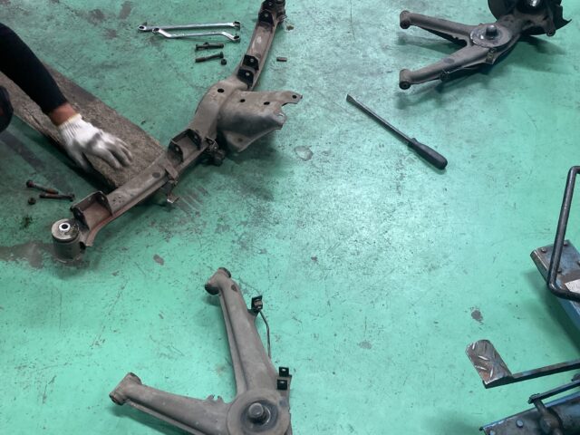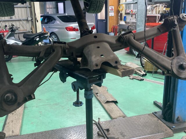 リアアクスルブッシュの交換です。重いので大変です。